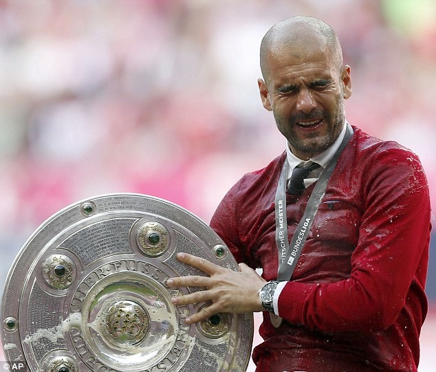 | Pep Guardiola giơ cao chiếc Đĩa bạc đầu tiên trong sự nghiệp. |