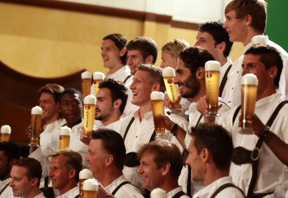 | Dàn sao Bayern Munich giơ cao cốc bia trong buổi quảng cáo trong năm 2010 khi đó Hùm xám được dẫn dắt bởi HLV Louis Van Gaal. |