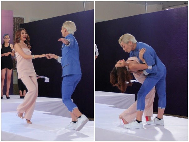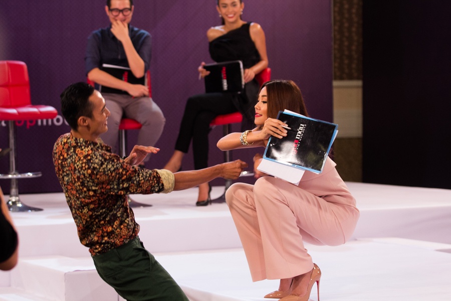 | Thanh Hằng được thí sinh dìu ra sân khấu, cùng anh thể hiện một số động tác. Nữ giám khảo tỏ ra hào hứng nhún nhảy theo BB Trần. |