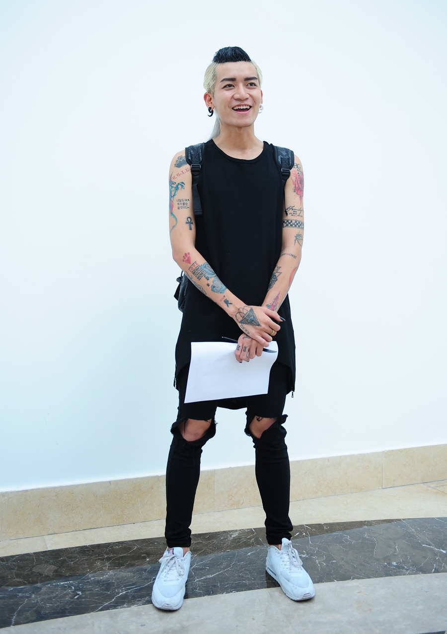 Khác với hình ảnh casting online, trưởng nhóm hài BB&BG sinh năm 1990 để lại ấn tượng với ngoại hình cá tính cùng loạt hình xăm lạ mắt khi tham gia sơ khảo trực tiếp.