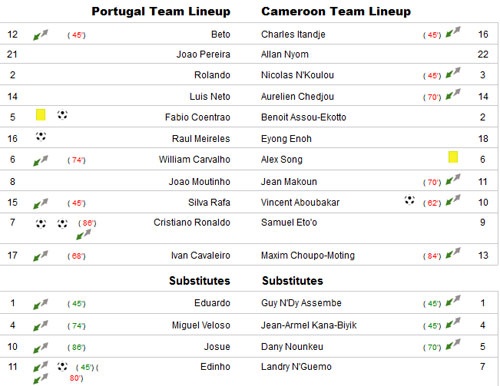 Ra sân trong trận giao hữu gặp Cameroon, Ronaldo có lần thứ 110 khoác áo ĐT Bồ Đào Nha. Hiện tại, CR7 là cầu thủ chơi cho đội tuyển quốc gia nhiều thứ 2, xếp sau Luis Figo với 127 trận. Đang có phong độ tốt, ngôi sao thuộc biên chế của Real đã đưa Bồ Đào Nha vượt lên dẫn trước bằng một cú sút hiểm hóc ngay sát vạch 16m50 ở phút 21.