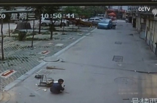 | Vụ việc xảy ra vào khoảng 11h trưa (giờ địa phương) tại thành phố Tế Ninh, tỉnh Sơn Đông, Trung Quốc. Một cậu bé 6 tuổi đang ngồi chơi với búa và đống gỗ dưới lòng đường. |