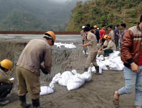 Doanh nghiệp sản xuất chì kẽm đã huy động máy móc, công nhân sử dụng lưới B40, đá hộc bịt vị trí tấm bêtông bị vỡ.