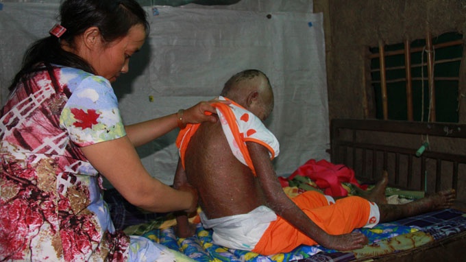 Khi chúng tôi đến nhà, em Hiếu đang nằm trên giường trong căn nhà ọp ẹp, chật chội, được dựng bằng mấy thanh tre và vách đất. Bà Hường buồn bã tiếp lời: “Hiếu bị bong da đến mức mi mắt bị kéo lên sát trán, nằm ngủ không thể nhắm mắt, miệng cũng không thể mím hết. Thấy con đau đớn cực khổ quá mà không biết làm cách nào cho con hết”.