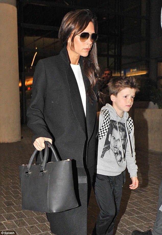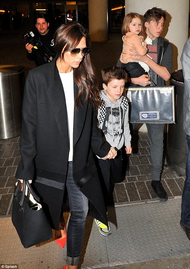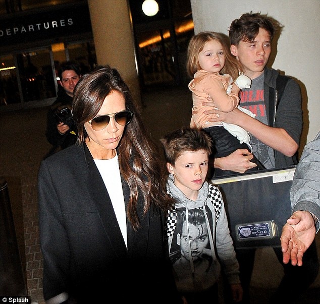 Tối 28/3, Victoria Beckham dẫn Brooklyn, Cruz và cô công chúa nhỏ Harper rời sân bay Los Angele, Mỹ. Vợ con cựu danh thủ nổi tiếng David Beckham vừa trải qua một chuyến bay dài từ London tới Mỹ và không khỏi mệt mỏi.