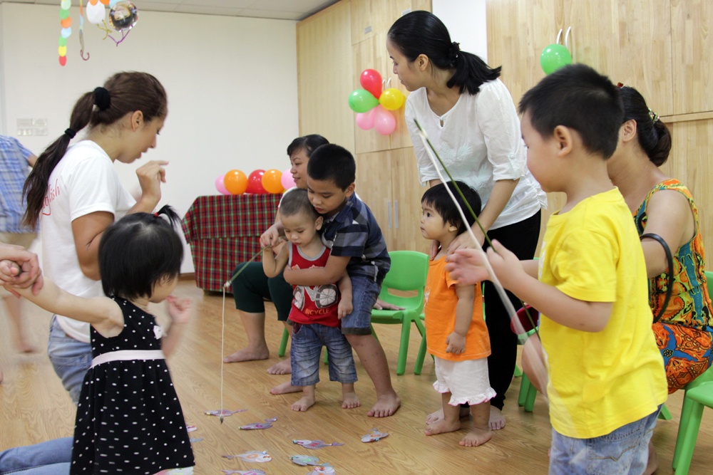 Tại ngày hội, bên cạnh những trò chơi vận động, sáng tạo, các bé đang ở lứa tuổi mầm non còn được làm quen với tiếng anh thông qua nhiều hoạt động thú vị. Trong ảnh: Cô Vic người Canada, đã giảng dạy tại Việt Nam hơn một năm, hướng dẫn các bé chơi trò câu cá tìm chữ cái.
