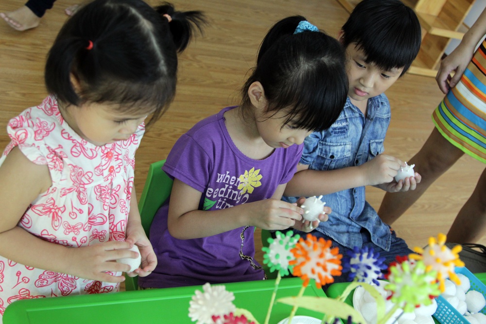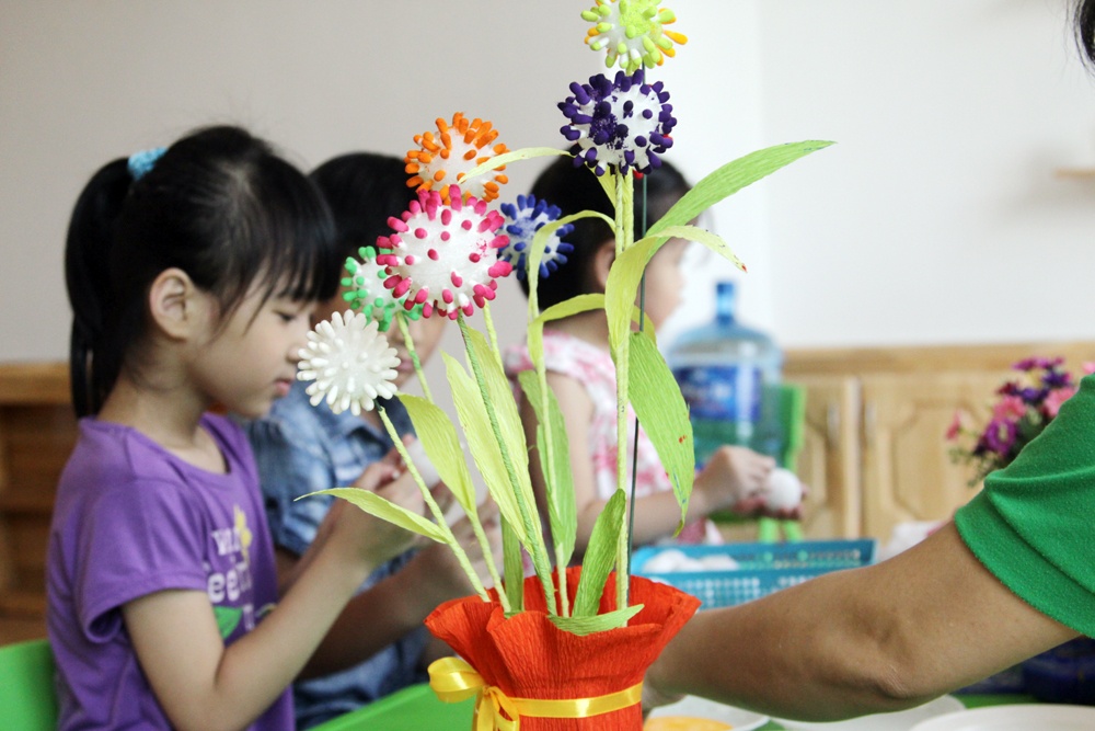 | Những trò tạo hình đơn giản mà khéo léo như làm hoa từ bông tăm, in vân tay, in hoa, nhỏ mầu nghệ thuật, làm nhẫn tặng bạn, làm bướm bằng giấy mầu và kẽm nhũ cũng thu hút các bé 3-5 tuổi. |