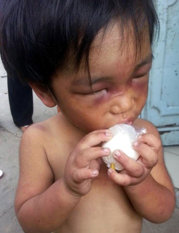 | Cháu Đức lúc đi ăn xin ngoài đường, gương mặt còn đầy thương tích được người dân phát hiện. |
