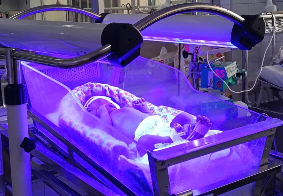 Trẻ được chiếu đèn ngay sau sinh để điều trị vàng da. Ảnh: BVCC. |