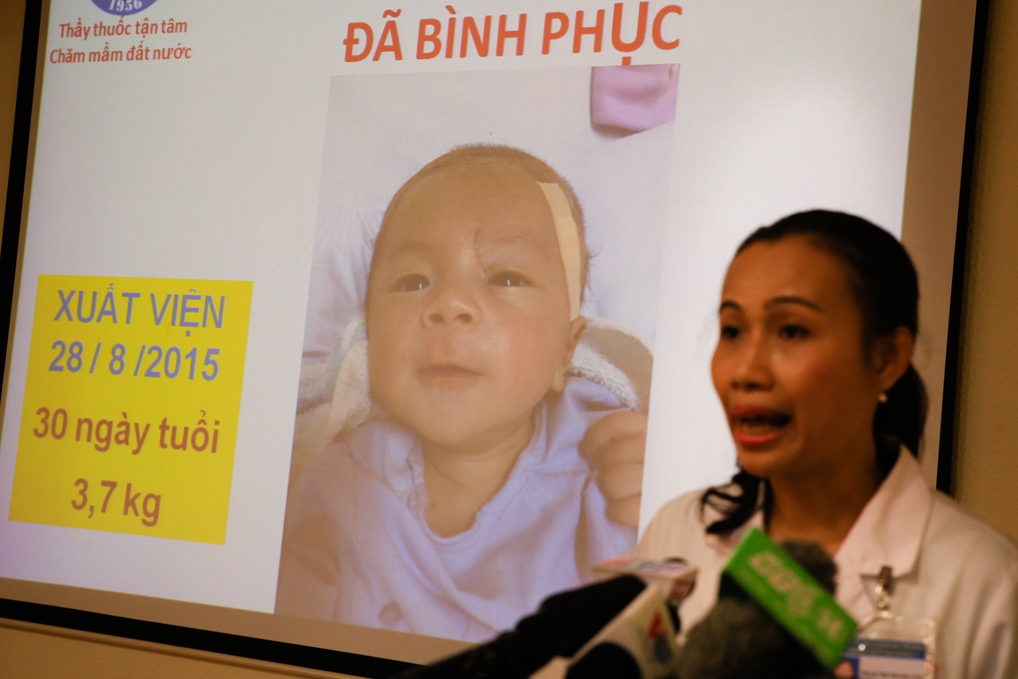 Trước đó, vào 3h ngày 8/8, bé Phát điều trị viêm phổi tại Bệnh viện Đa khoa Vĩnh Long. Khi đang ngủ thì mẹ bé là Võ Thị Hồng Duyên (32 tuổi, ở Vĩnh Long) phát hiện một người lạ ở trong phòng (nghi là kẻ trộm) nên hốt hoảng la to. Lúc này, bất ngờ bà Nguyễn Thị Vân (51 tuổi, quê ở Bến Tre) cầm con dao dài 28 cm đâm thấu sọ bé. Bé đã được chuyên gia, bác sĩ tiến hành phẫu thuật. Trong ảnh: Bác sĩ Phạm Thị Minh Tâm - Trưởng khoa Hồi sức thông tin về tình hình sức khỏe của Phát.