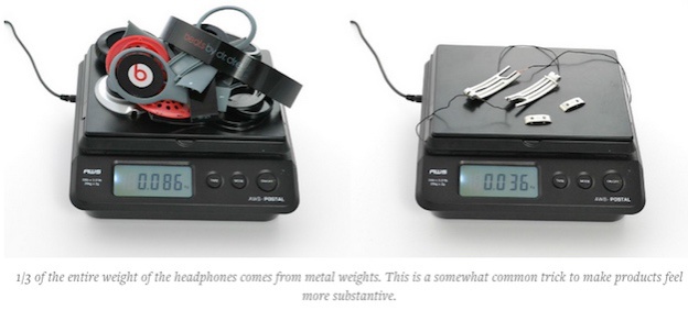 Louie cho biết, Beats cho thêm các thành phần không cần thiết để tai nghe của họ có vẻ nặng hơn. “Một trong những điểm đáng giá nhất của chiếc Solo là cảm giác cầm”, Louie giải thích. “Một chút trọng lượng tạo cảm giác chắc chắn, bền và có giá trị cho sản phẩm. Cách để tạo ra điều này với chi phí thấp là đính thêm một số mảnh kim loại. 30% trọng lượng của chiếc Beats Solo đến từ 4 mảnh kim loại nhỏ với mục đích tăng trọng lượng tai nghe”.