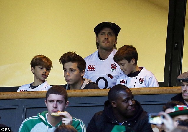 Chiều thứ bảy, bố con nhà Becks bị bắt gặp khi đang chăm chú xem bóng bầu dục tại sân vận động quốc tế QBE tại Twickenham.