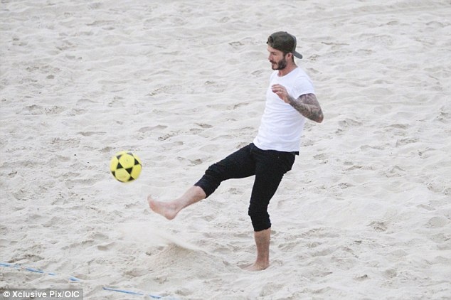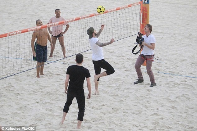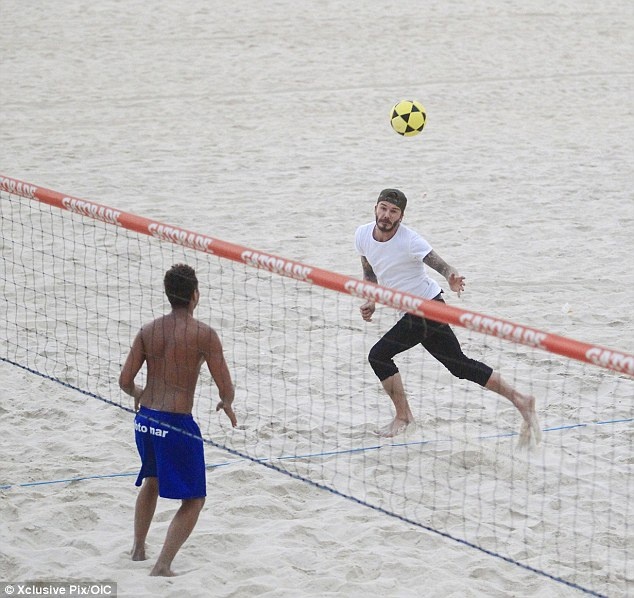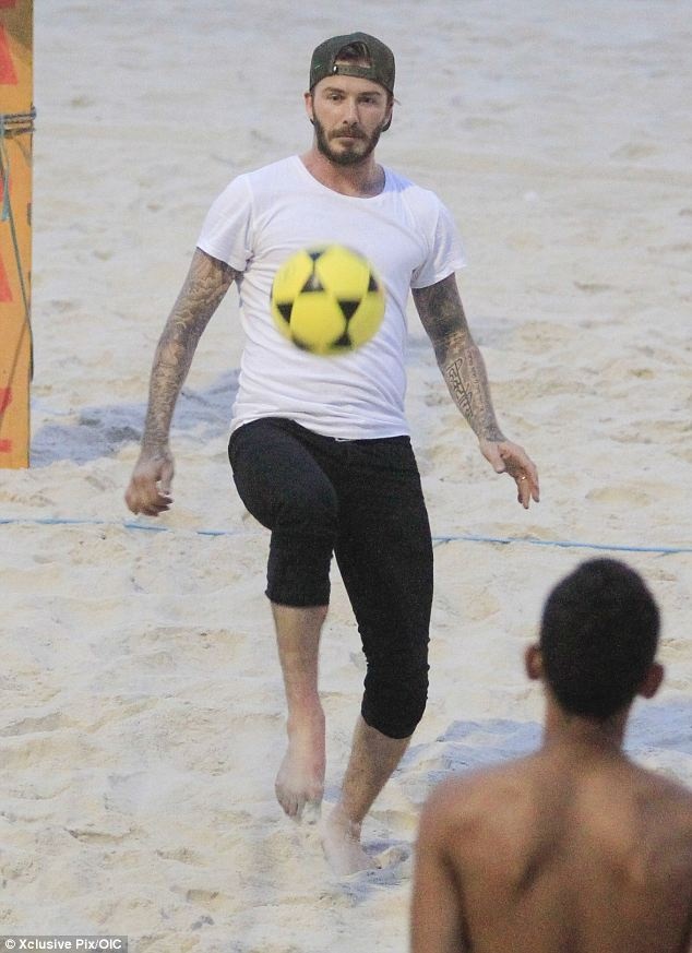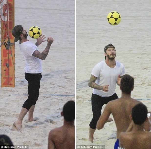 | David Beckham xắn quần, đi chân đất trổ tài chơi bóng chuyền bằng chân. |