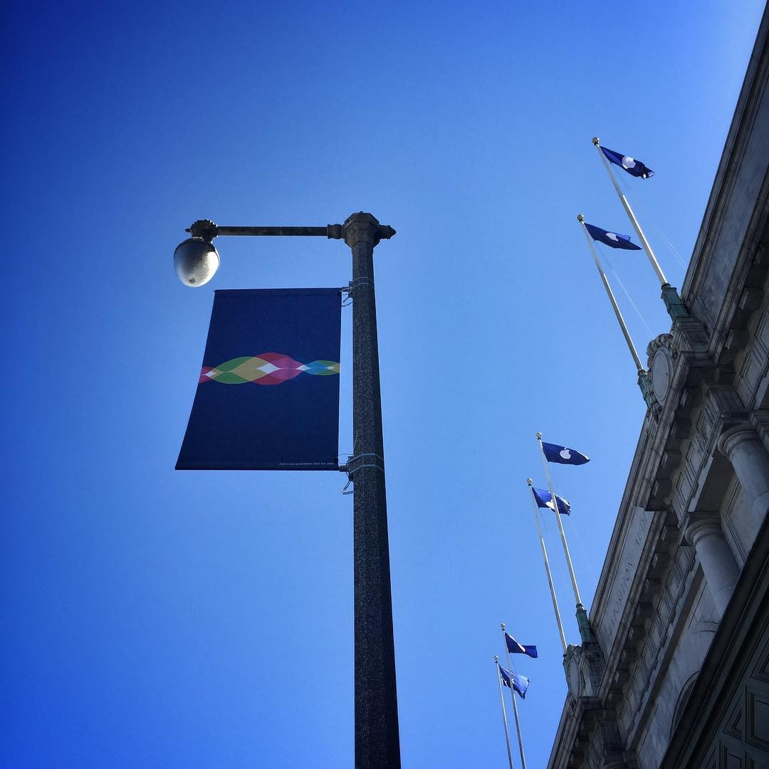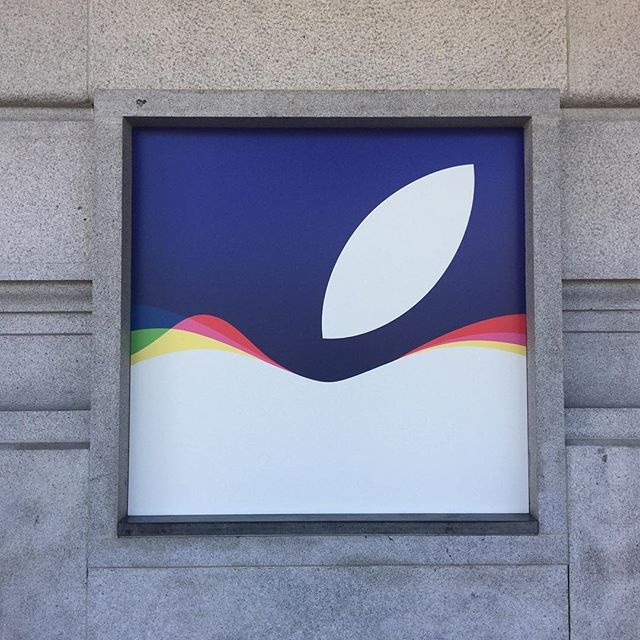 | Lá cờ bên ngoài tòa nhà cũng được "nhuộm" các màu biểu trưng của Apple. |