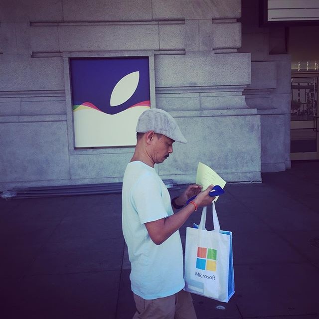 | Một tín đồ của Microsoft đi ngang tòa nhà và thờ ơ với sự kiện sắp diễn ra. |