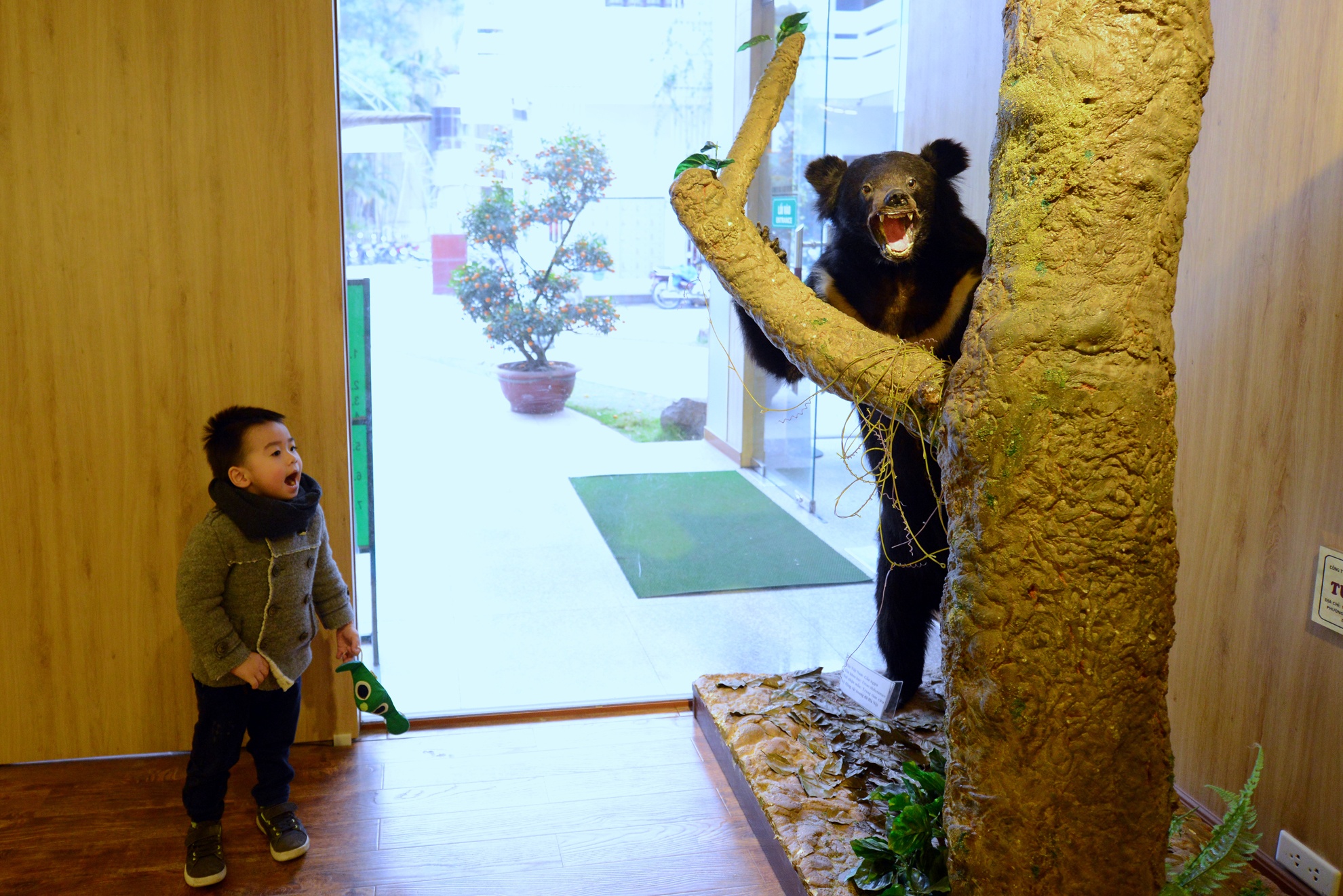 | Trẻ nhỏ thích thú với mẫu vật gấu Đông Dương. |