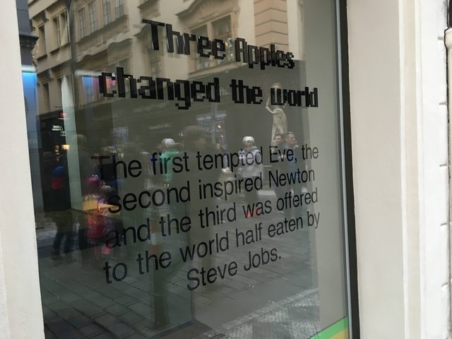 Ba quả táo thay đổi thế giới: Quả táo cám dỗ Eve - khởi thủy của nguồn gốc loài người, quả táo truyền cảm hứng cho Newton và cuối cùng là quả táo cắn dở tượng trưng của Apple. Thông điệp này được ghi lại ngay bên ngoài lối đi vào bảo tàng. |