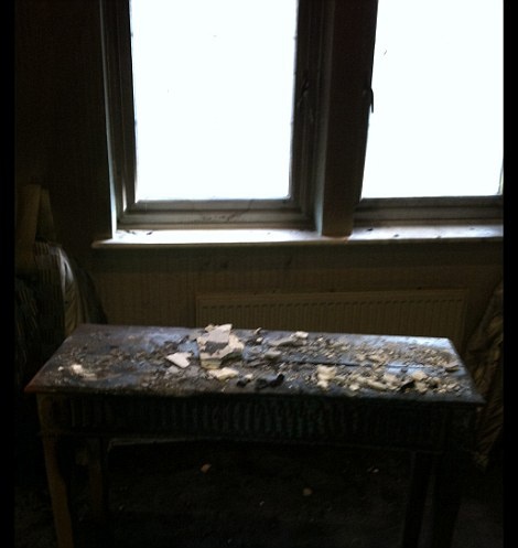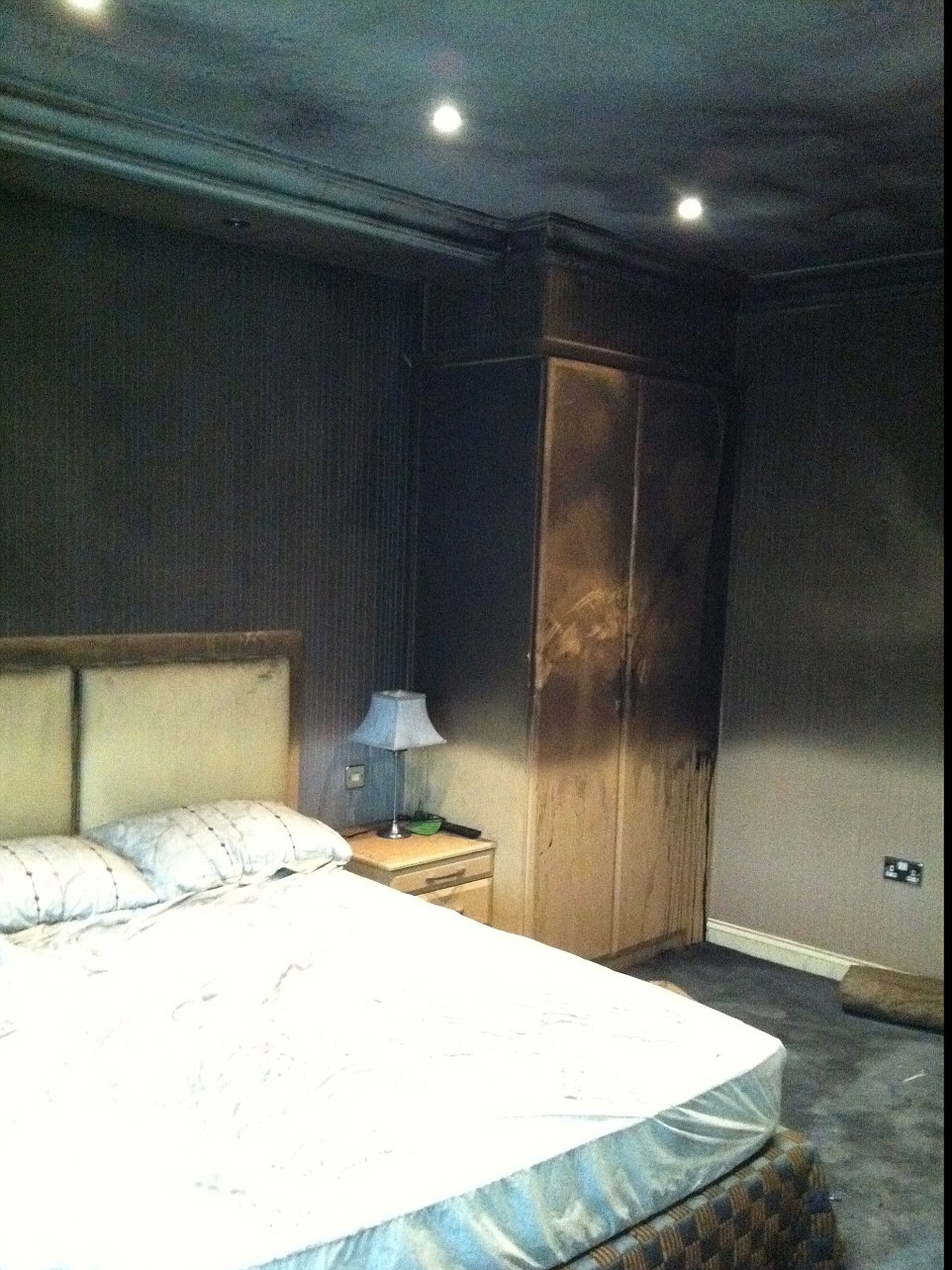 | Trần và tường phòng khách cũng bị ảnh hưởng bởi vụ cháy. |