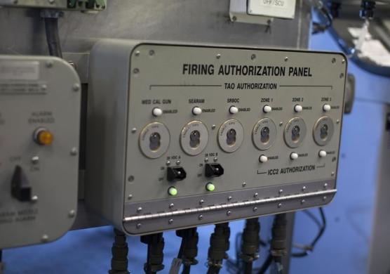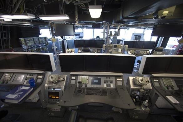 Bảng điều khiển hỏa lực trong phòng thuyền trưởng. Con tàu trang bị pháo Bofors cỡ nòng 57 mm, 11 ống phóng tên lửa Evolved SeaRAM, 2 trực thăng SH-60 Seahawk và trực thăng không người lái MQ-8 Fire Scout. |