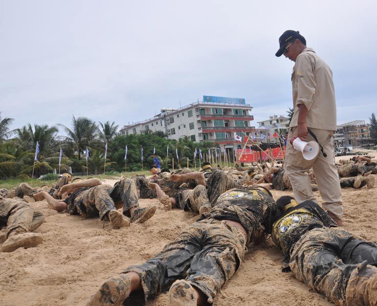 Hơn một trăm học viên trải qua khóa huấn luyện vệ sĩ tại bãi biển Tam Á, đảo Hải Nam, Trung Quốc. Nhiều học viên muốn trở thành người bảo vệ các doanh nhân, gia đình giàu có. Ảnh: news.cn.