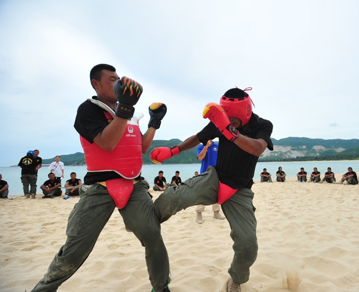 Màn luyện đấm bốc tại bãi biển Hải Nam. Nhiều công ty huấn luyện vệ sĩ còn thuê các các võ sư, chuyên viên từ Israel, Hàn Quốc. Số phụ nữ giàu ở Trung Quốc tăng lên trong những năm gần đây. Đa số họ muốn tìm vệ sĩ nữ để vừa có người bảo vệ, lại vừa có bạn tâm tình. Ảnh: news.cn.