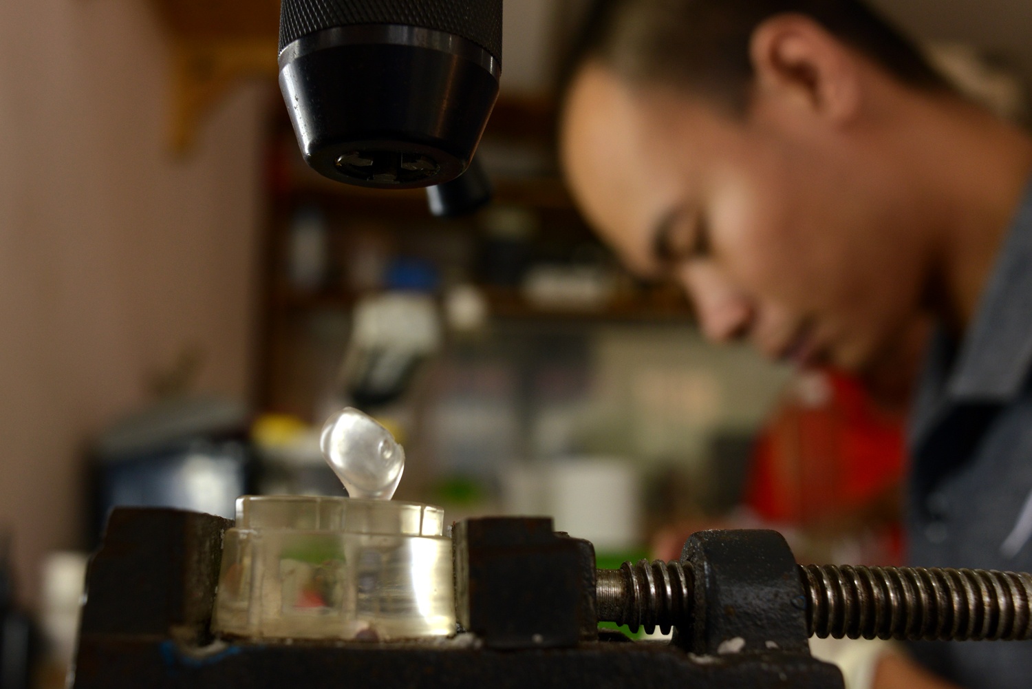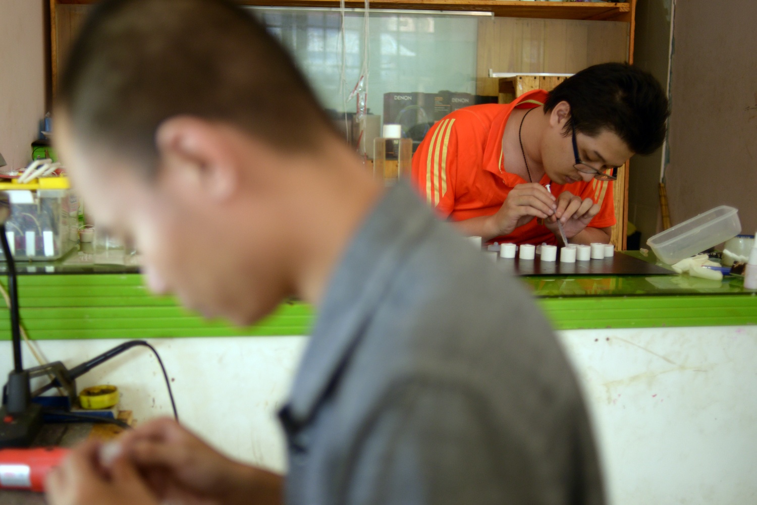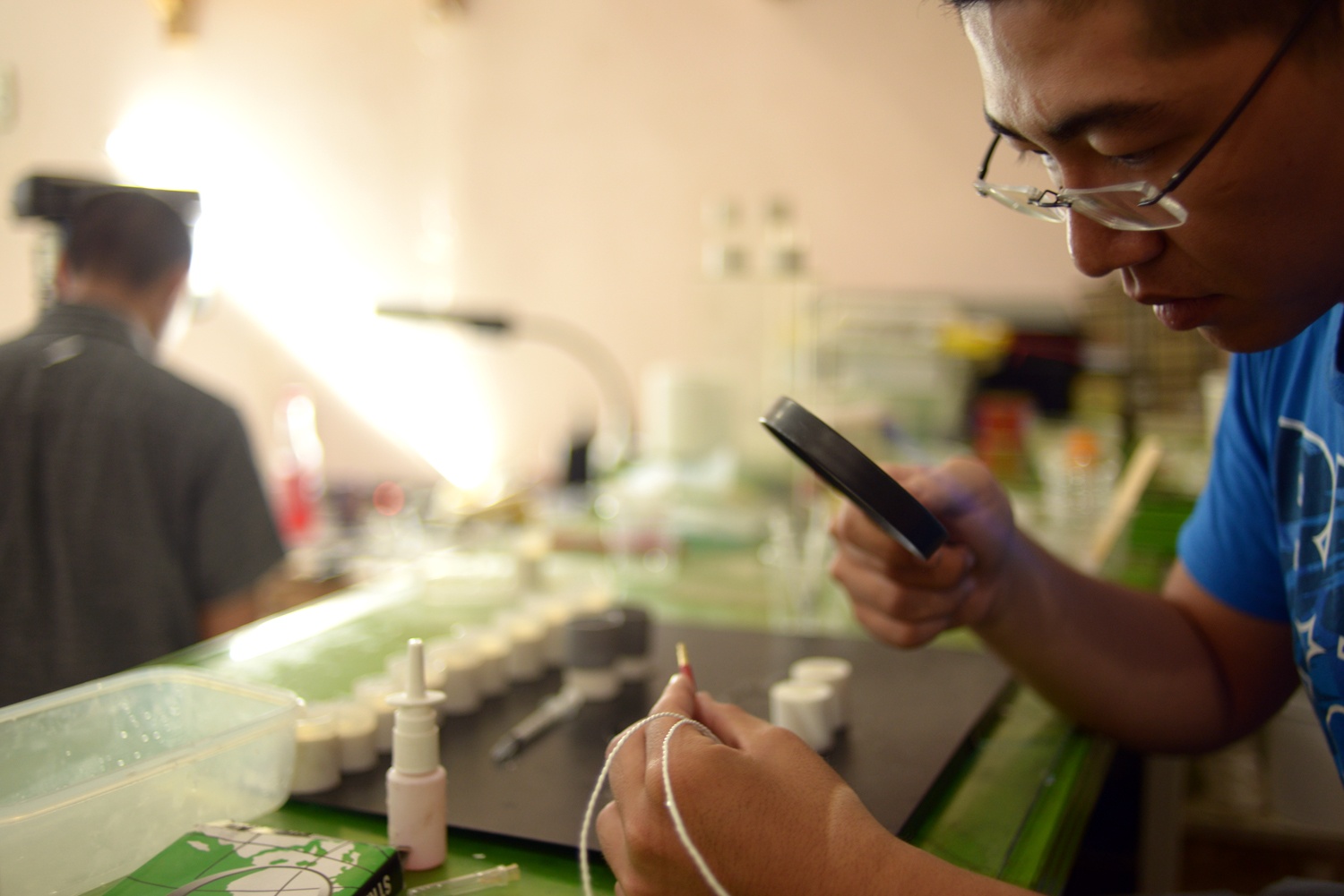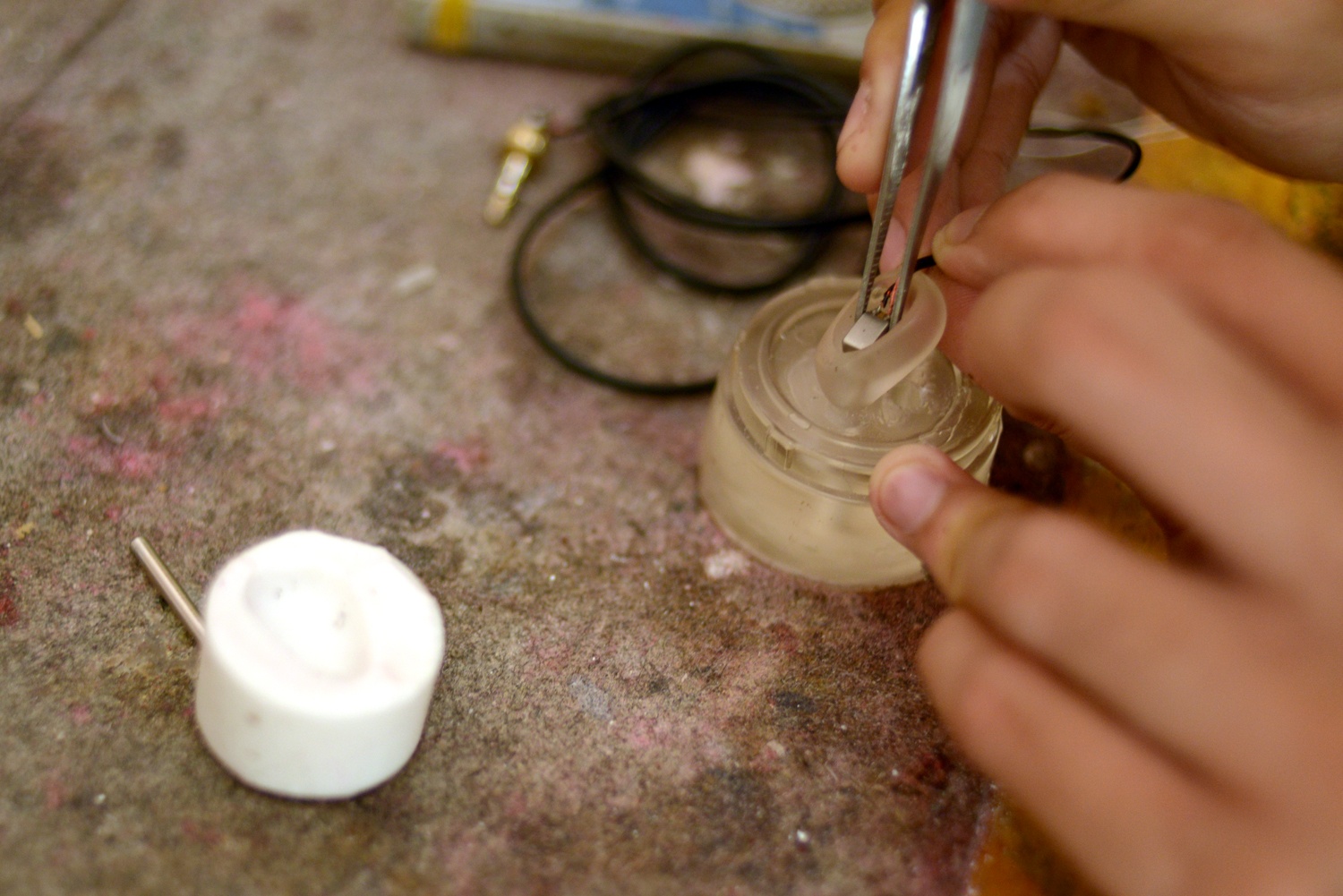 | Một thành viên trong nhóm đang khéo léo đặt driver Amateur Driver vào vỏ. Amateur Driver là loại màng tương tự như loa thu nhỏ giúp cho âm thanh chân thực hơn. Công đoạn này là một trong những phần quan trọng của quá trình làm tai nghe. |