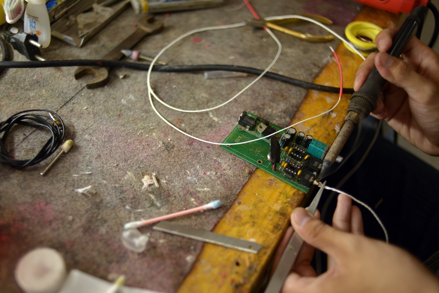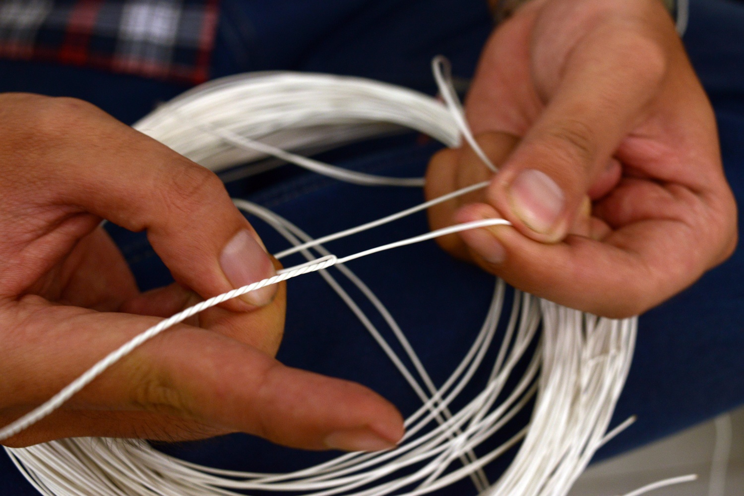 Anh đang thực hiện quá trình tết dây tai nghe (được nhập từ Nhật Bản). Giống như các bước làm khác, công đoạn này cũng được làm thủ công nên sản phẩm có độ bền và mỹ thuật cao. |