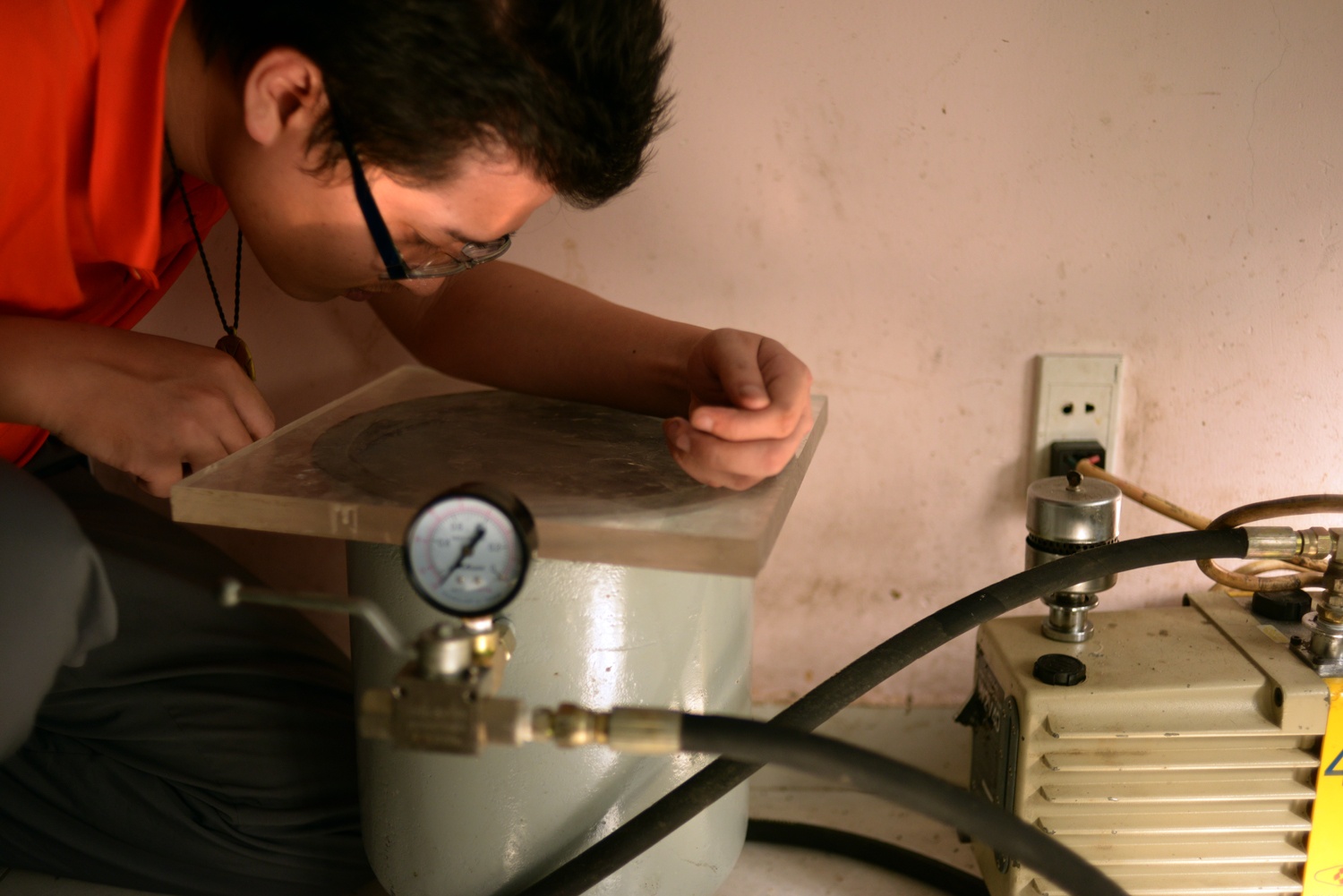 Xưởng sản xuất tai nghe handmade của "gã khùng" Trần Mạnh Hùng và nhóm Joinhandmade nằm ở quận 3, TP.HCM. Đây là chiếc máy hút chân không công suất lớn được chế từ vỏ bình gió đá. Nhựa để chế tạo vỏ tai nghe được đưa vào đây để nhào và hút hết không khí. |