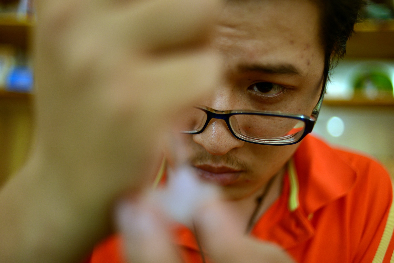 Ngô Kỳ Quang, một người trong nhóm có trách nhiệm kiểm tra từng công đoạn của tai nghe. Quang cho biết, mỗi một lỗi nhỏ trên sản phẩm đều bị loại bỏ để làm mới. |