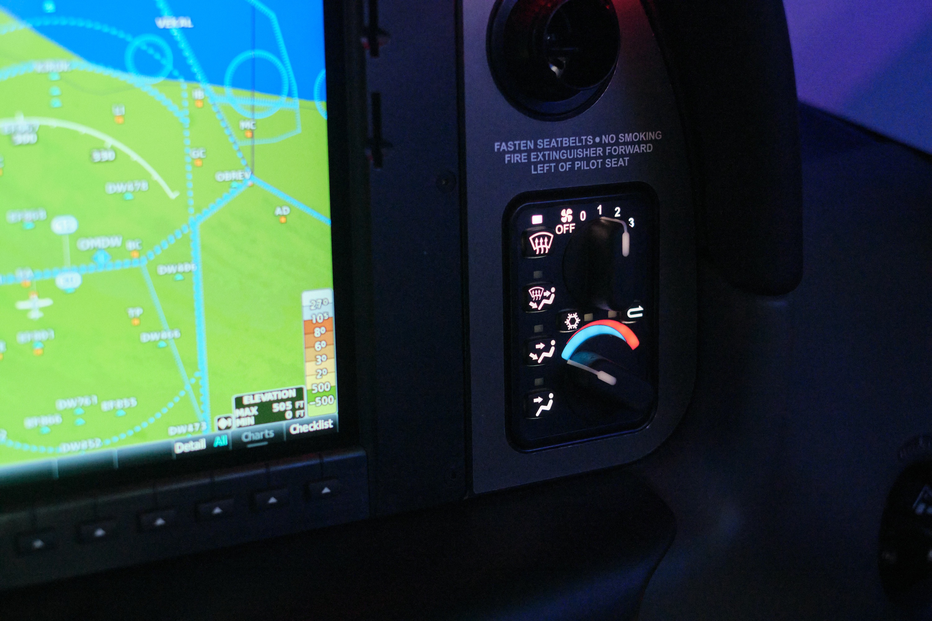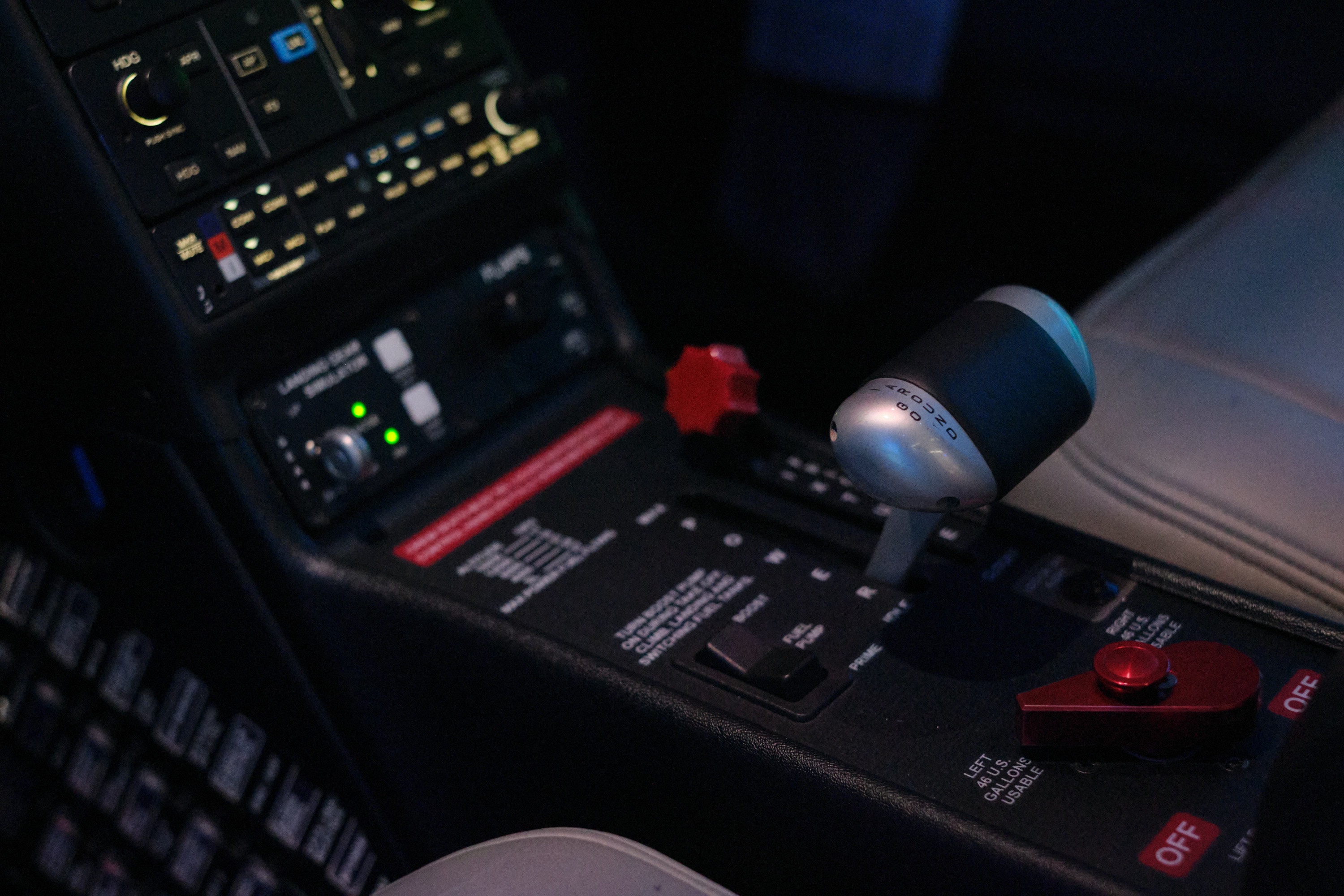 | Thiết bị trong bài giả lập là Cirrus SR22 G6, loại máy bay một động cơ với 4 chỗ ngồi. Khi bước vào khoang cabin, học viên có thể chọn một trong 2 vị trí hành khách ở phía sau, hoặc ngồi lên ghế phi công ở phía trước. Tôi được 2 người bạn nhường cho vị trí phi công, ngồi cạnh giảng viên của học viện. Cả 2 vị trí đều có thể điều khiển máy bay khi di chuyển, nhưng ghế phi công chính có thêm một số màn hình hiển thị, và chìa khóa để nổ máy cũng nằm phía đó. |