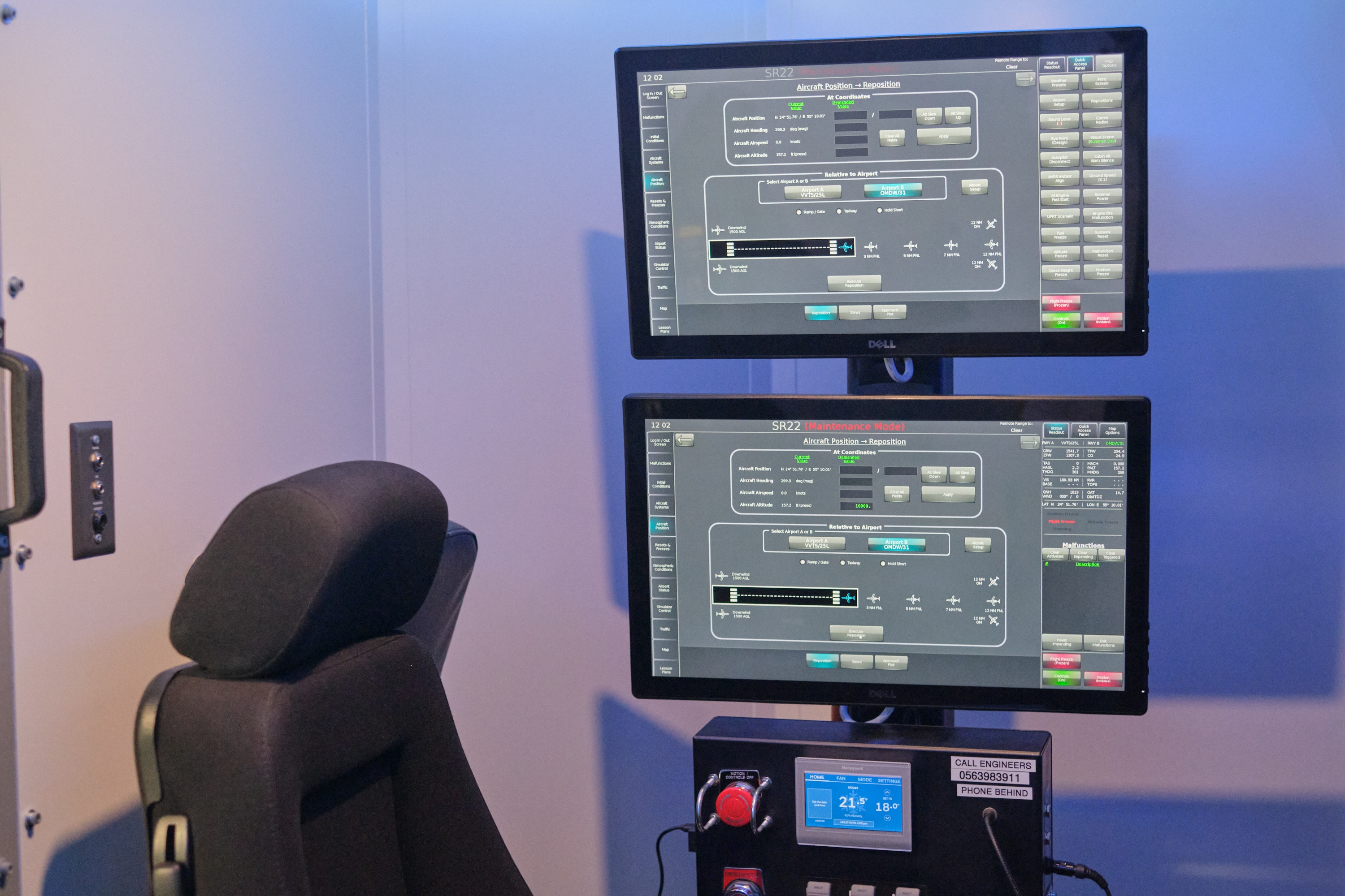 | Xung quanh buồng lái là một màn hình toàn cảnh, cho phép học viên quan sát như nhìn ra cửa sổ của máy bay thật. Hệ thống giả lập được trang bị nhiều khu vực sân bay nổi tiếng như Dubai (UAE), Heathrow (London, Anh) hay Charles de Gaulle (Paris, Pháp). Ngoài ra, các hình thái thời tiết như mưa, gió cũng có thể được lựa chọn để học viên học cách đối phó. Mọi dao động, rung lắc khi bay cũng được tái hiện. Trong hình là khi máy bay đi qua Quần đảo Cọ (Palm Jumeirah) trước khi quay về sân bay riêng của học viện, nằm phía Nam thành phố Dubai. |