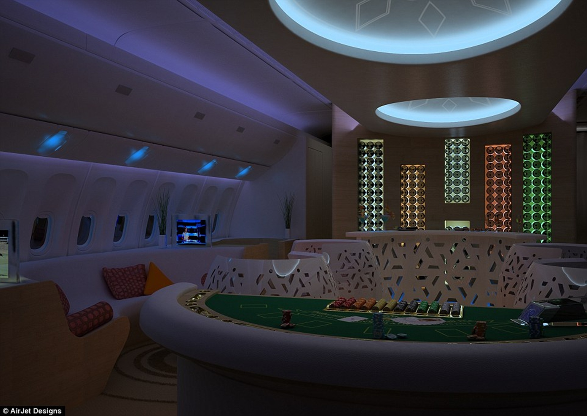 Theo Daron Dryer, Giám đốc kỹ thuật của Comlux America: “Sự cải tiến được thực hiện dựa trên nhu cầu của khách hàng. Họ muốn có những trải nghiệm xa xỉ giống như trên mặt đất”. “Các chuyên cơ cá nhân phải kết hợp được các đặc điểm và tiện nghi mới để khách hàng vẫn được tận hưởng các nhu cầu cá nhân như ăn uống, nấu nướng, chăm sóc cơ thể, thể thao, giải trí, công nghệ hiện đại nhất”, ông nói. Jean-Pierre Alfano, Giám đốc sáng tạo của AirJet Designs lại bày tỏ: “Khách hàng muốn chúng tôi dám mơ ước, vượt qua các giới hạn và sáng tạo”. Trong hình là sòng bạc trên chuyên cơ riêng.