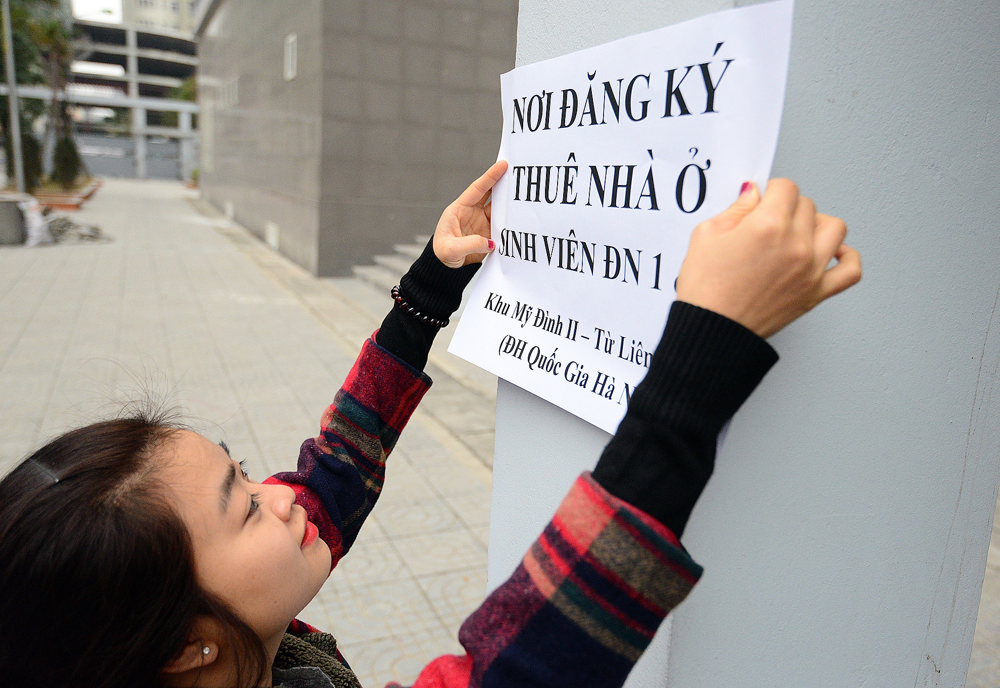 | Thạch Anh (phải), một nhân viên văn phòng hiện thuê trọ tại chung cư mi ni ở Xuân Đỉnh (quận Bắc Từ Liêm) cho biết, cô đến làm hồ sơ thuê nhà cho em trai là sinh viên năm nhất ĐH Công nghiệp Hà Nội. Cô đang ở thuê một phòng chung cư mini nhưng giá 2,5 triệu đồng/tháng. Tới đây em cô sẽ chỉ phải trả 215.000 đồng/tháng (chưa bao gồm chi phí điện, nước, gửi xe ...). |