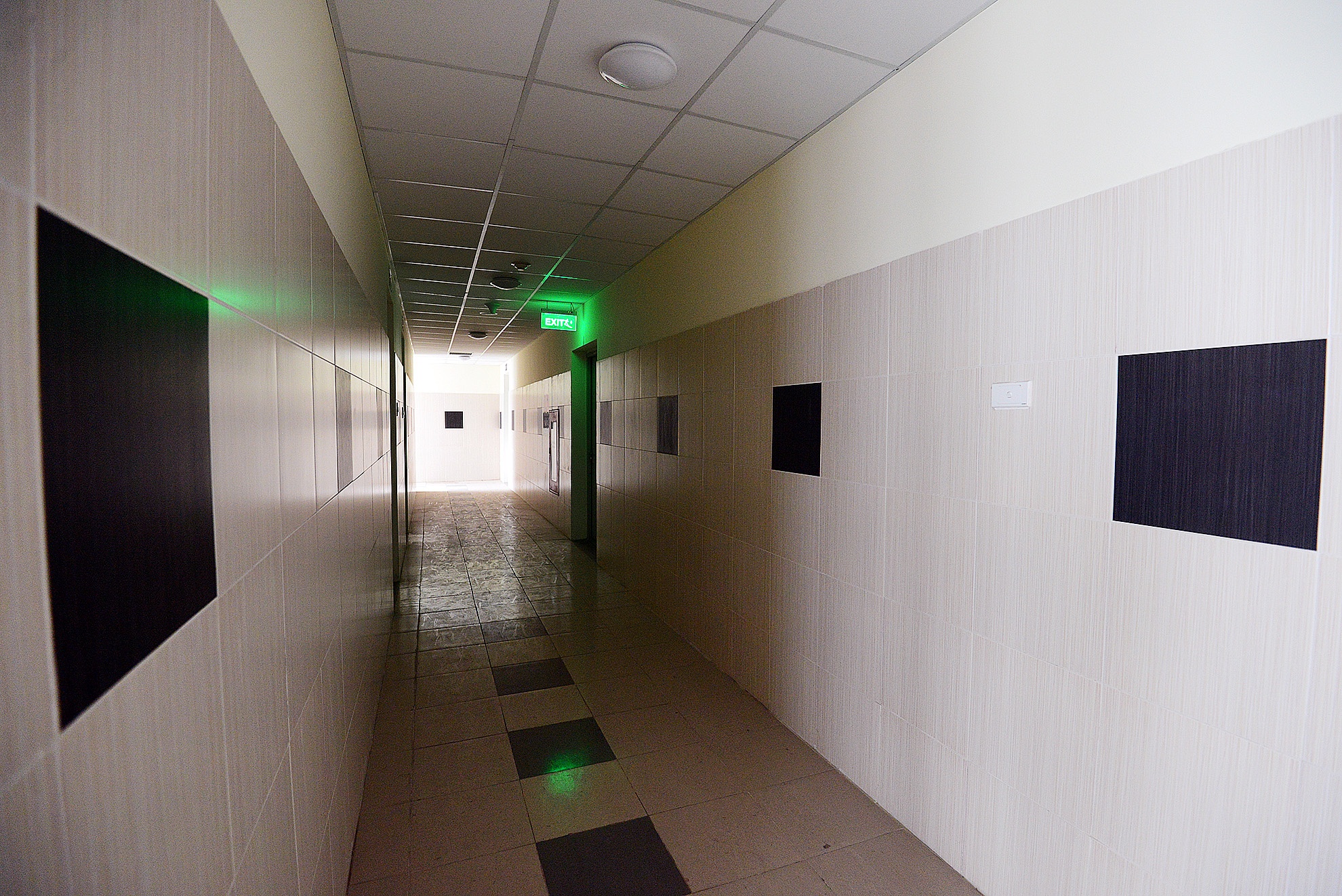 Hành lang thông thoáng, được ốp gạch sàn và tường, hệ thống đèn chiếu sáng, camera hiện đại. |