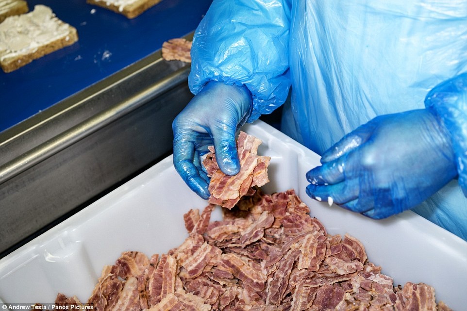 | Công nhân kẹp bơ, thịt xông khói vào bánh. |