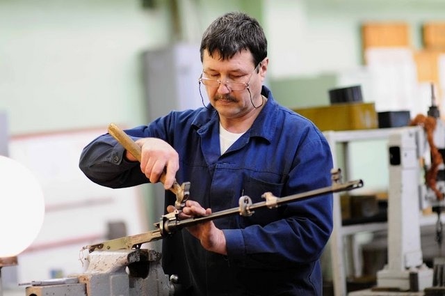 Công nhân thao tác phần thân một khẩu súng với những loại thiết bị đơn sơ.