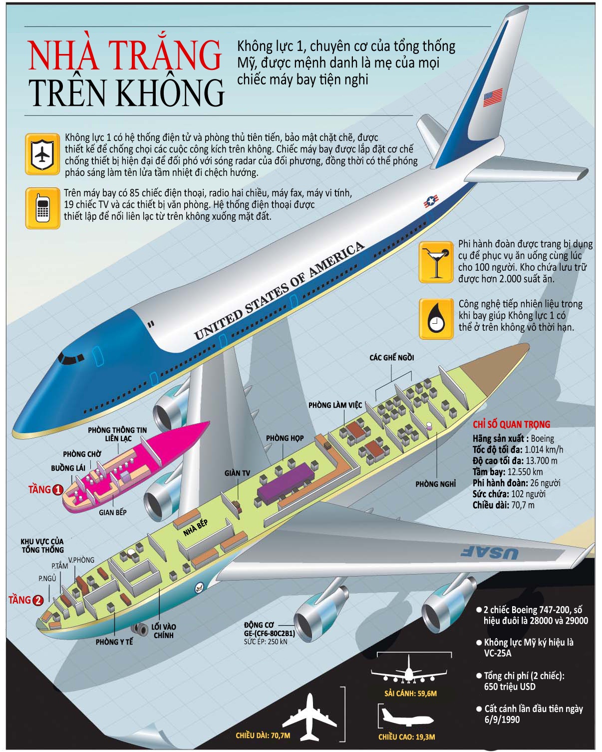 Được ví như "Nhà Trắng trên không", Không lực 1 là phi cơ hiện đại, đầy đủ tiện nghi, chuyên chở tổng thống Mỹ và đoàn tùy tùng cấp cao trong các chuyến công du quan trọng.