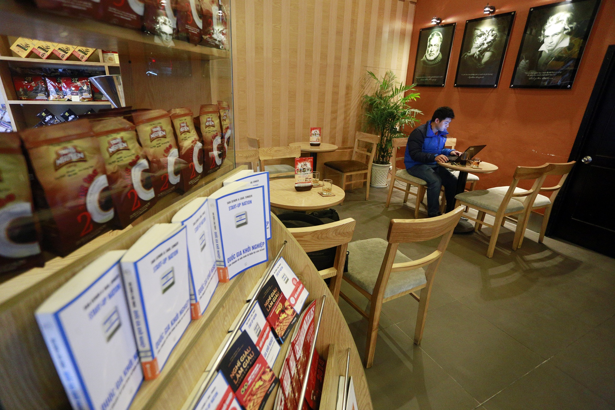 Quán trên phố Đinh Tiên Hoàng với những cuốn sách như Quốc gia khởi nghiệp, Nghĩ giàu làm giàu... được đặt ở lối ra vào. Tuy nhiên, ngay phía trên là cà phê - thế mạnh lớn nhất của Trung Nguyên.