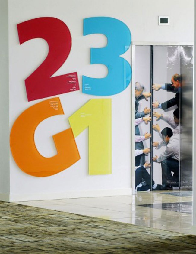 Cửa thang máy cũng được trang trí hình ảnh vui nhộn.
