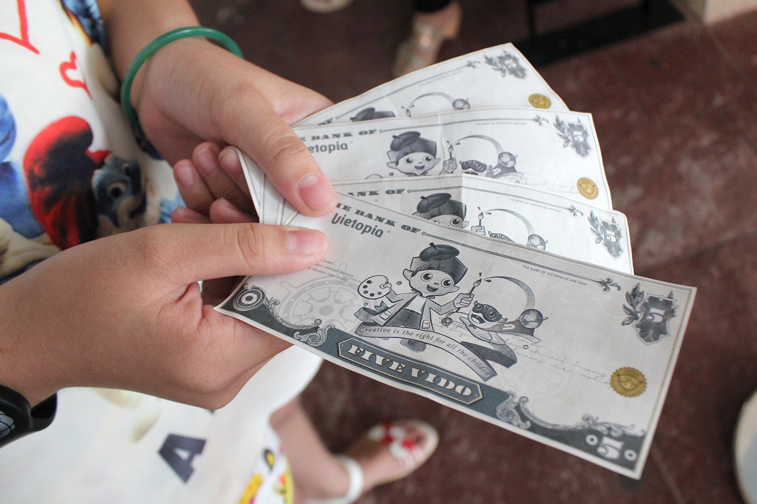 Sau khi tham gia làm việc, các bé còn được nhận lương bằng một loại tiền được lưu hành nội bộ. Số tiền công kiếm được này các bé có thể tham gia nhiều trò chơi khác. |