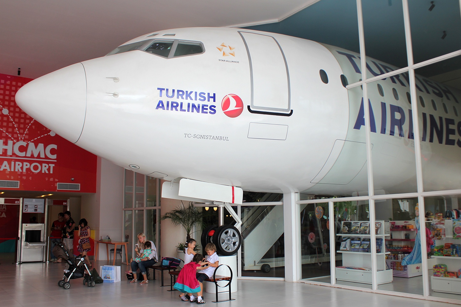 Mô hình một chiếc máy bay với buồng điều khiển để trẻ trải nghiệm công việc của một phi công, tiếp viên hàng không và hành khách đi trên máy bay. |