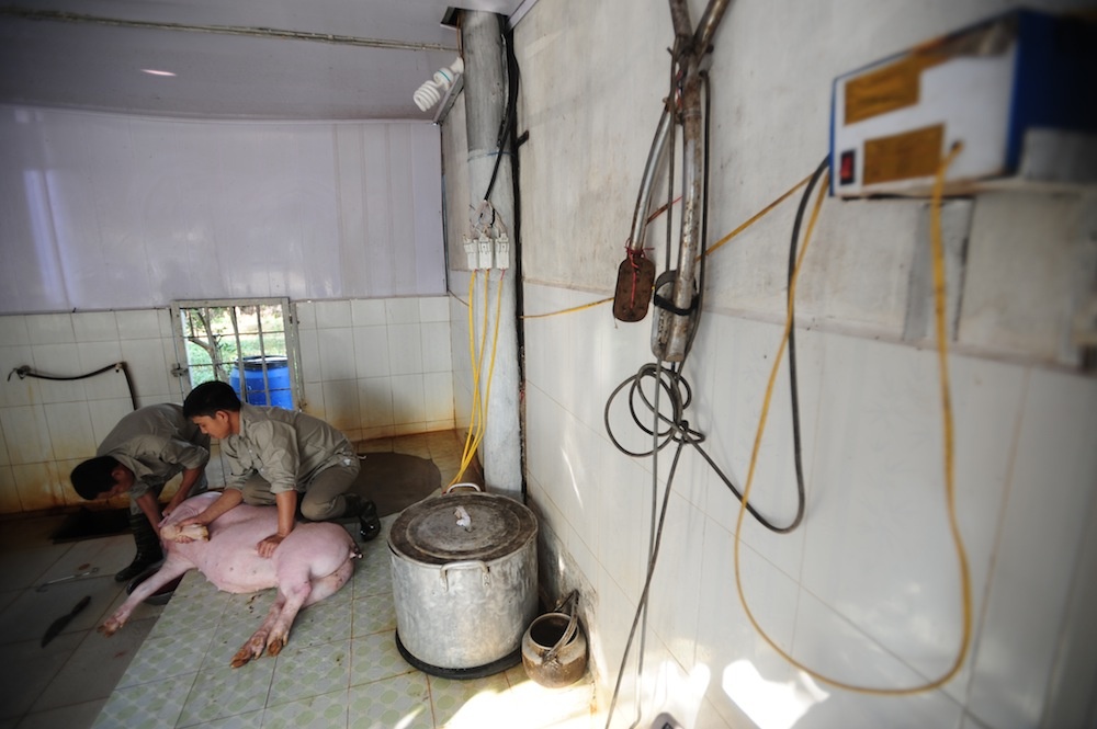 | Quá trình giết mổ lợn tiến hành bằng cách sử dụng kìm điện gây ngất. Việc này đảm bảo lợn trong trại thái bình thường, không bị stress trước khi giết mổ. |