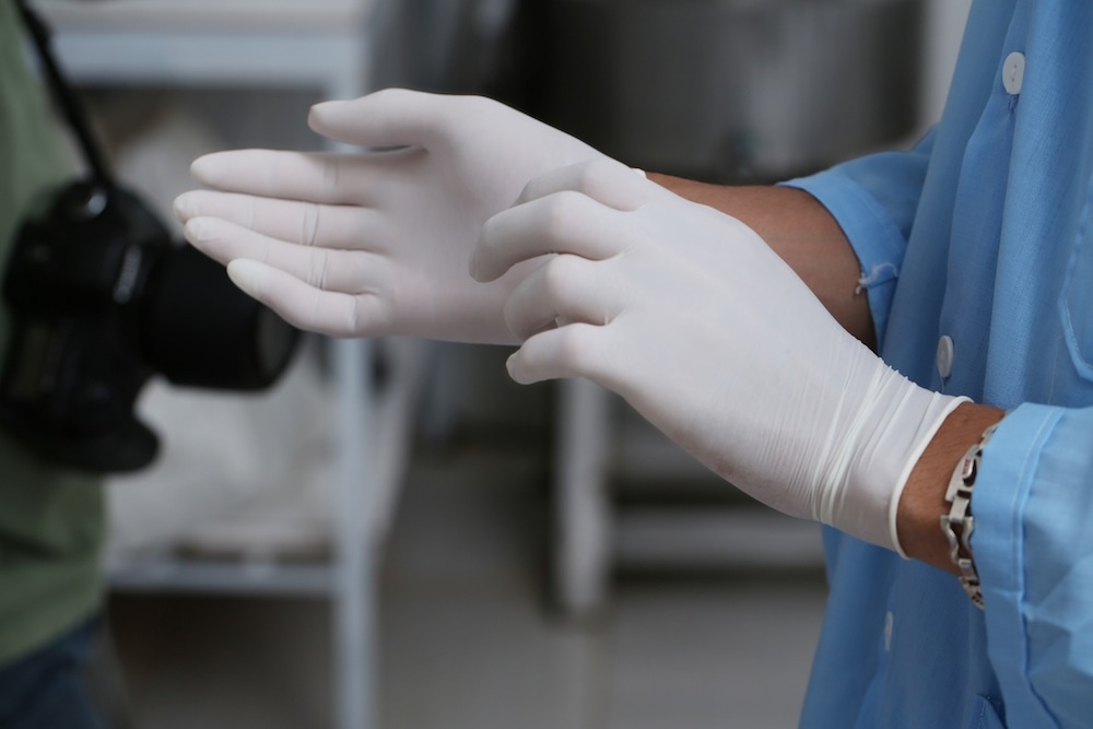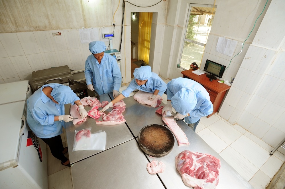 | Công nhân pha cắt thị lợn đeo găng tay đảm bảo vệ sinh trong phòng lạnh. |