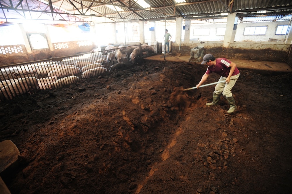 | Đệm lót sinh học của chuồng lợn sau thời gian khoảng một năm sẽ làm phân bón hữu cơ phục vụ cho trồng trọt. |