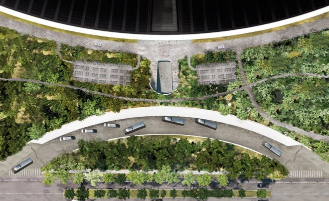 | Khu trung chuyển (Transit Center) và cổng vào chính, nhìn từ trên cao. |