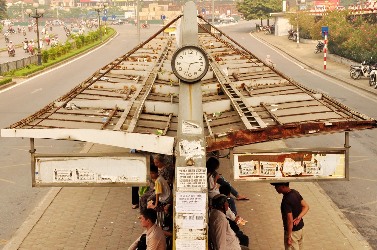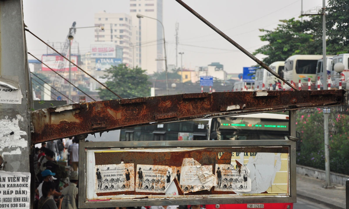 | Tấm bảng hướng dẫn lịch trình xe buýt cũng vỡ một mảng lớn, kính nham nhở, quảng cáo dán chằng chịt, lớp nọ đè lên lớp kia. |
