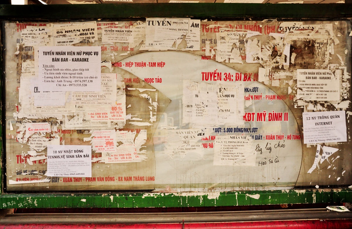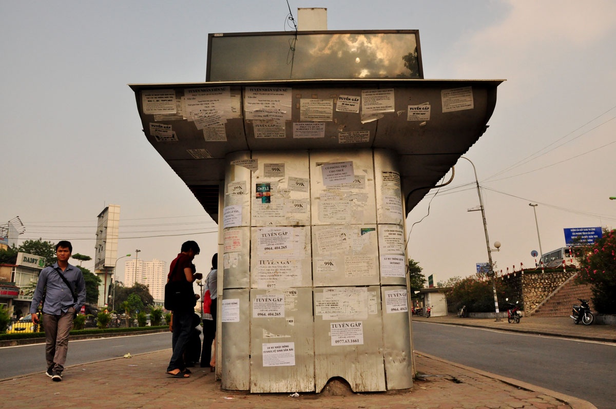 | Dãy nhà chờ như thể bị bỏ hoang bởi hàng nghìn tờ rơi được dán khắp nơi, từ dưới đất lên đến tận trần, hàng rong đỗ nhan nhản. |