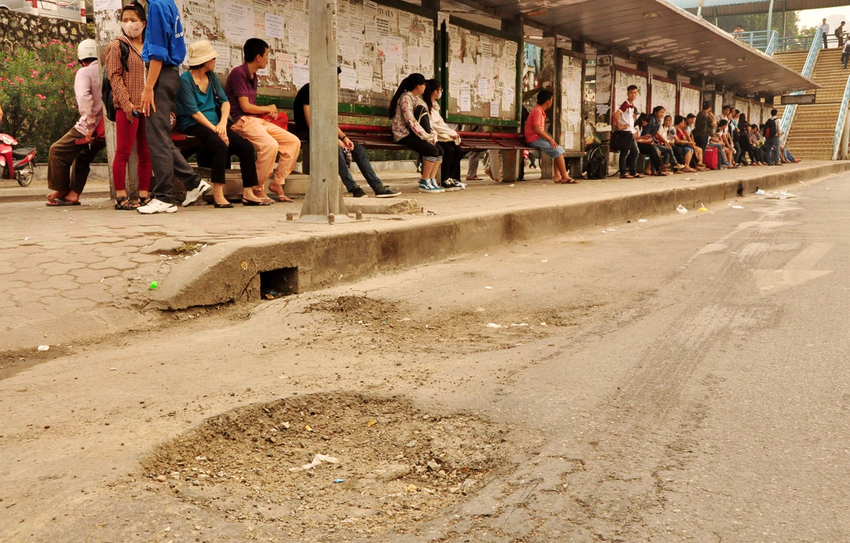 | Mặt đường nhiều đoạn lún thành ổ gà, đọng nước khi trời mưa. Mỗi khi xe buýt chạy qua, nước lại bắn tung tóe lên người hành khách. |