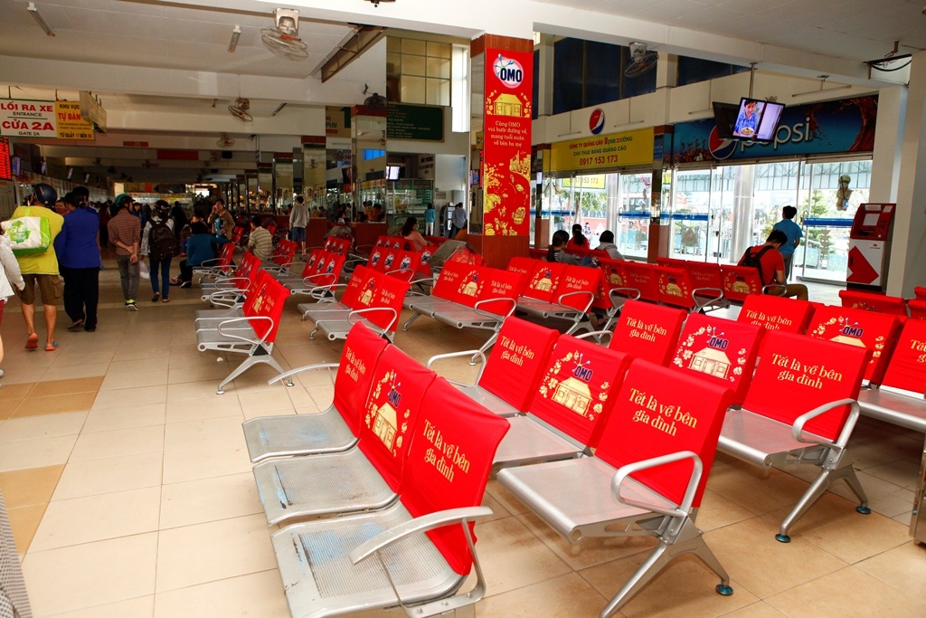 | Bước vào khu vực bán vé, hành khách thấy ngay một hàng ghế chờ đỏ rực. Nơi này vừa được lắp đặt máy lạnh, cột Wi-Fi, sửa chữa nhà vệ sinh, mang đến hình ảnh đối lập hoàn toàn so với trước đây. |