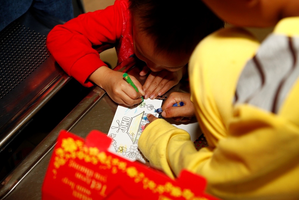 | Các bé tô màu cho hộp quà trong lúc chờ đợi. |